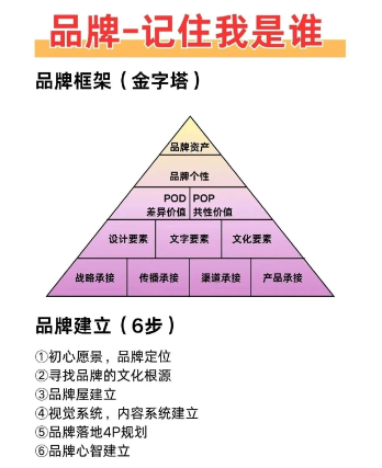 1. 品牌:目标是让用户“记住我是谁”,从用户心智角度定义。通过品牌CIS等体系,在用户侧形成强记忆与选择偏好,企业侧提升忠诚度与复购率。构建含品牌资产、个性等的金字塔框架,按6步建立品牌。