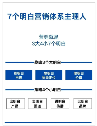 6. 7个明白营销体系:战略上要“看明白市场”“想明白势能定位”“做明白价值”;策略上要“出明白产品”“卖明白渠道”“讲明白传播”“记明白品牌”。