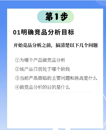 开展前需明确:为哪款产品做分析;产品处于什么阶段;当前面临的核心问题与挑战;分析目的(支持决策、学习借鉴、市场预警,目的不同,后续方向有别)。