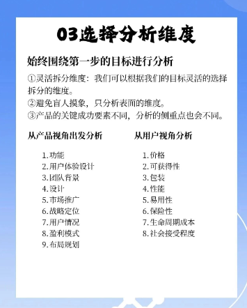 围绕分析目标,聚焦关键问题。因产品关键成功要素有差异,分析侧重点需灵活调整。