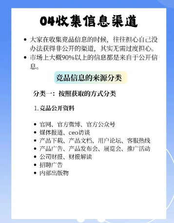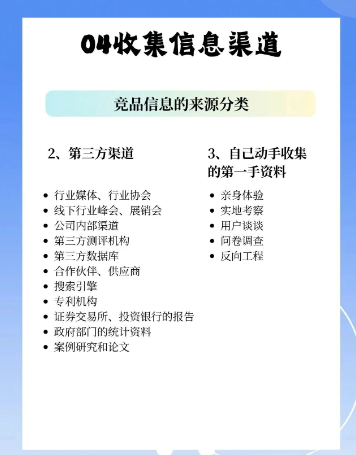 - 信息整理:涵盖集中(整合多来源信息)、分类(按竞品或维度重命名)、筛选(去重复)、组合(便于证伪)、评级(评估信息源可靠性与资料准确度)。