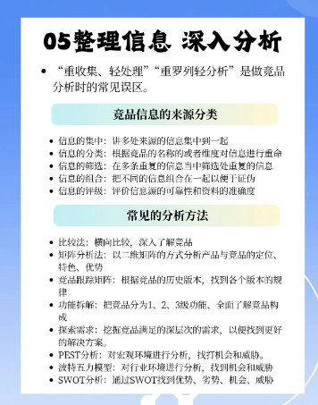 - 分析方法:比较法(横向对比竞品)、矩阵分析法(二维矩阵分析定位等)、竞品跟踪矩阵(从历史版本找规律)、功能拆解(拆分一至三级功能);还可通过探索需求(挖深层需求)、PEST分析(宏观环境找机会威胁)、波特五力模型(行业环境找机会威胁)、SWOT分析(找优劣势与机会威胁)开展。