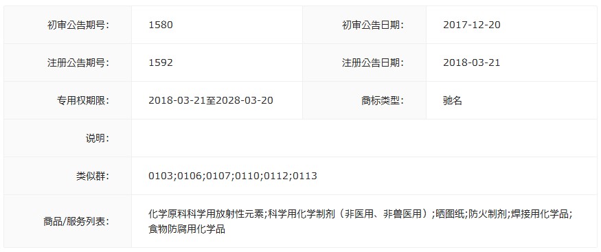 商品服务:化学原料科学用放射性元素;科学用化学制剂(非医用、非兽医用);晒图纸;防火制剂;焊接用化学品;食物防腐用化学品