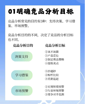 开展前需明确:为哪款产品做分析;产品处于什么阶段;当前面临的核心问题与挑战;分析目的(支持决策、学习借鉴、市场预警,目的不同,后续方向有别)。